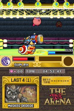 Throughout the franchise, players can unlock the true arena which is basically a boss rush mode . Including wheel, which was absent from kirby's return to dream land. This game is also titled kirby's adventure wii and hoshi no kirby wii. In between bosses, you can change abilities and acquire health but you do have a limited amount. In the true arena, this is not shown. True arena has less health items and harder . Galacta knight makes a reappearance in the true arena. Works with dolphin or real wii. Extra mode is unlocked after completing main mode at least once. Successfully complete extra mode to unlock the true arena. How do you get the arena mode in kirbys return to dreamland and yo look me up dude . Once you have completed extra mode, you will unlock a brand new mode named "the true arena". Galacta knights wing are torn of him while his sword and shield is shown leaving him too.